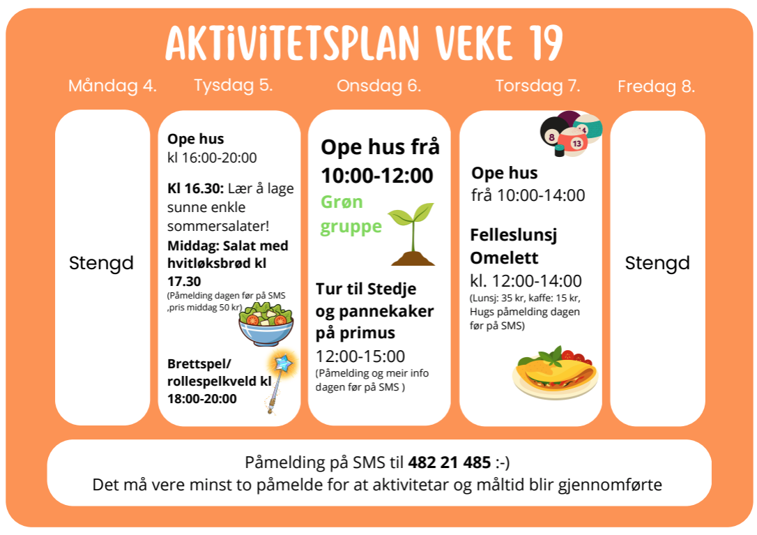 Nokre aktivitetar krev påmelding, medan andre er opne for alle. Dette er forklart i vekeplanen. Ta ein kikk på vekeplanen for aktivitetstilbodet denne veka: