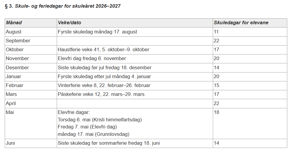 Skulerute 2026-2027 Lytt til teksten Innstillinger Oversikt over skuleåret, ferie og fridagar Skuleruta er publisert på lovdata: https://lovdata.no/dokument/LTII/forskrift/2025-11-10-2239 Skru på støtte for JavaScript for å vise denne funksjonen. Skrive av Turid Rauboti Publisert 15. april 2026