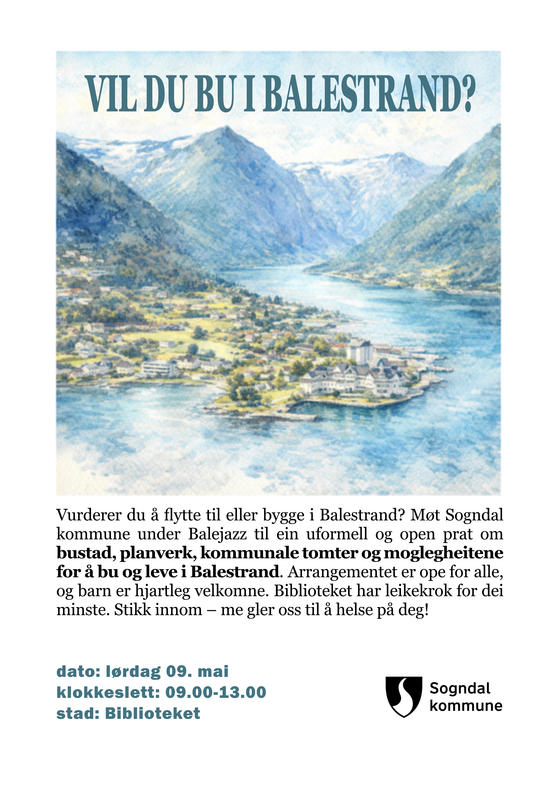 Vil du bu i Balestrand? Skrive av Benedicte Hole Publisert 29. april 2026 , Oppdatert 29. april 2026 Lytt til teksten Innstillinger Under Balejazz kan du møte Sogndal kommune på biblioteket i Balestrand. Har du spørsmål om bustad, tomter eller det kommunale planverket, er du hjarteleg velkomen innom for ein prat laurdag 09. mai kl. 9–13.Me gler oss til å sjå deg!